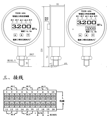 例:TDSB-484ZL智能壓力變送器,量程0~0.6MPa,RS485通訊接口,隔離膜片、接口、殼體都為不銹鋼,4位LED數(shù)顯,M20X1.5外螺紋壓力,徑向安裝,表壓型,3路報警。 |
